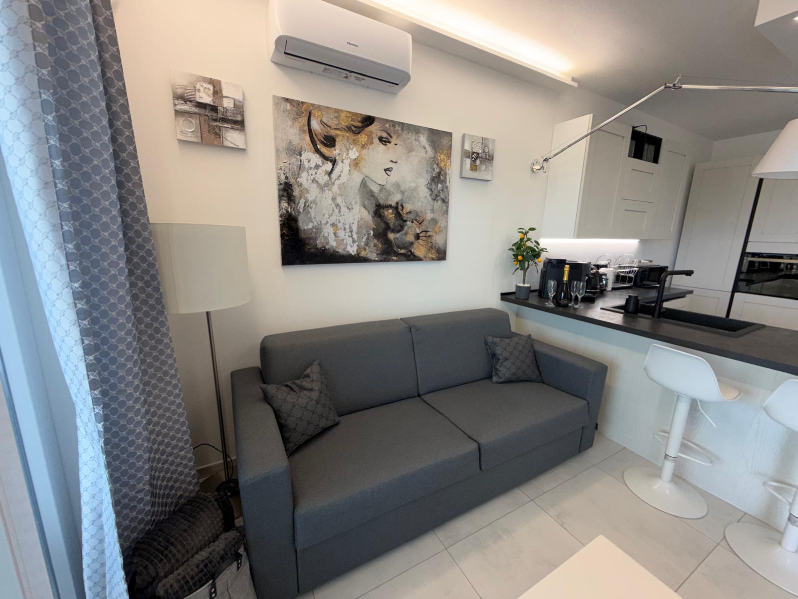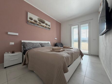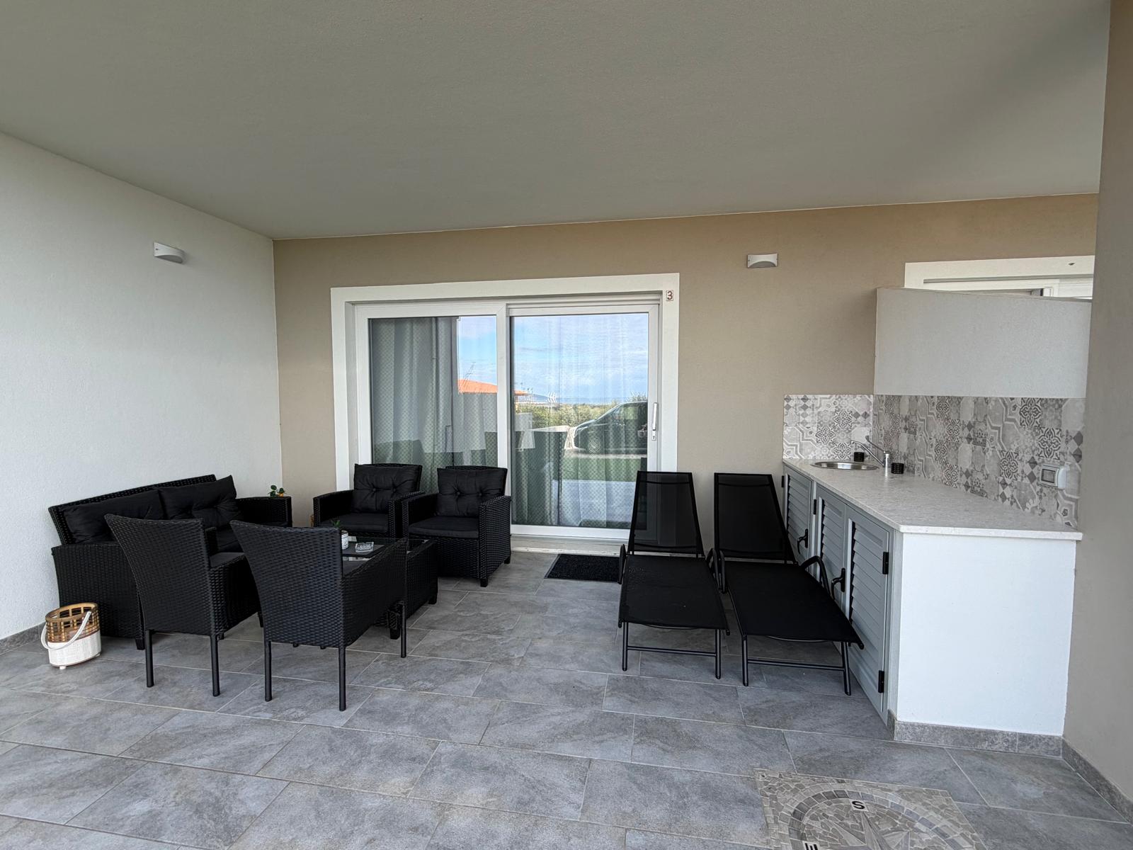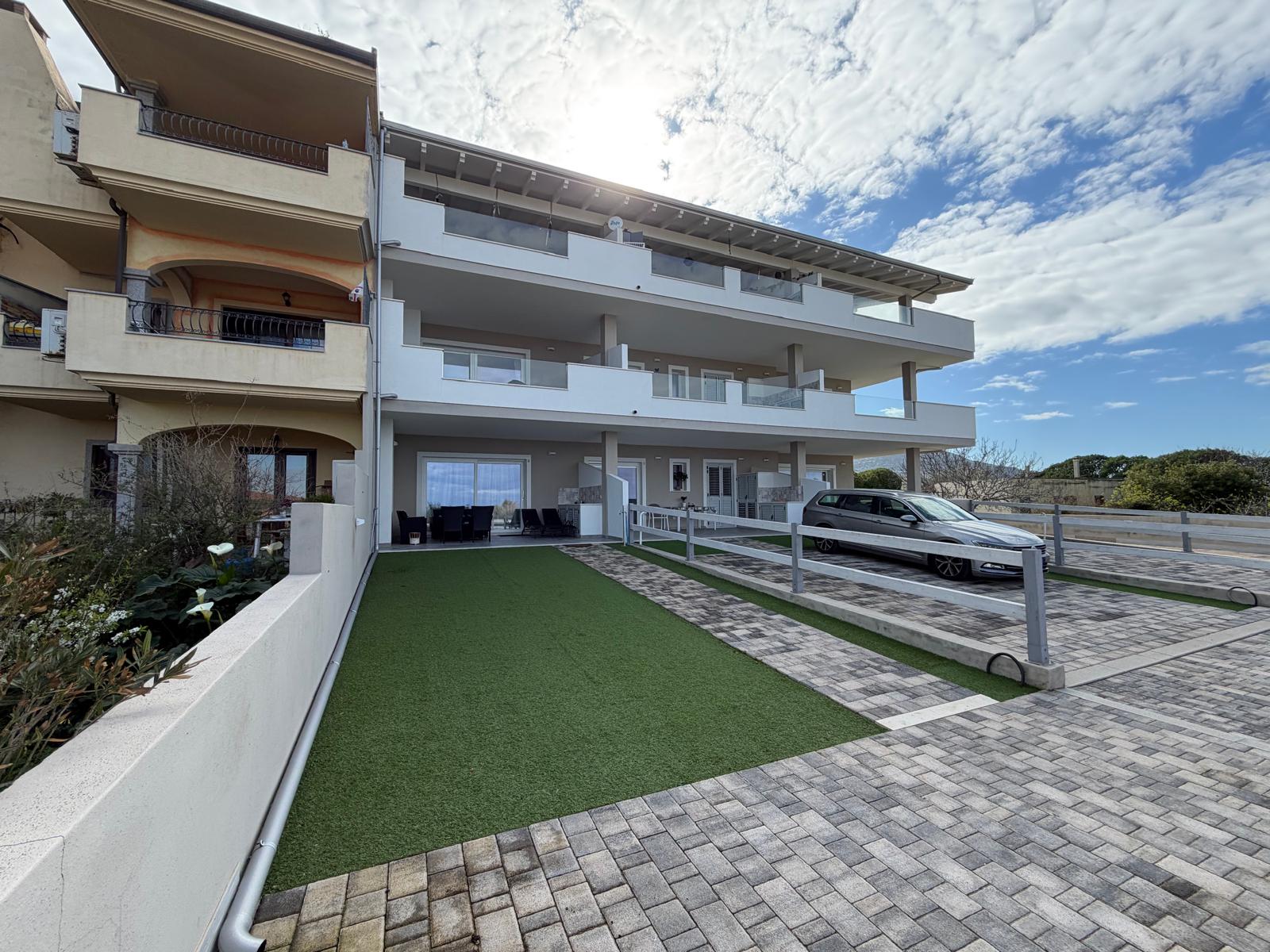 Rok starý apartmán se nachází v dolní části domu s dvěma terasami a předzahrádkou. Disponuje dvěmi parkovacími místy a krásným výhledem na moře a olivové háje. Na venkovní terase najdete i kuchyňku a prostor pro grilování.